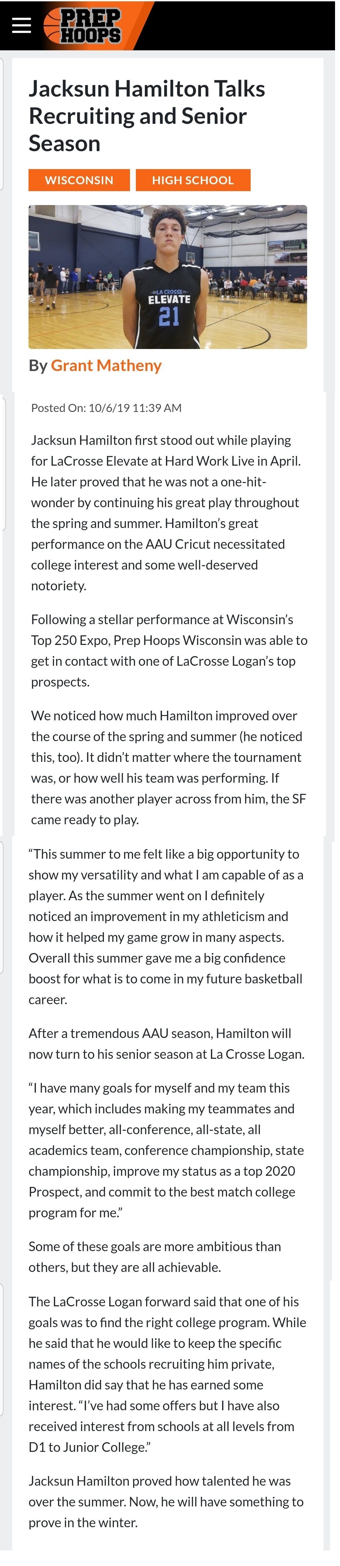 “ Jacksun is a highly respected young man who has a relentlessly work ethic. He is a versatile, athletic, high level 2-way player with good IQ. Great perimeter size. Plays the guard/wing position the right way. Can score, dribble, pass, rebound and defend. A high character” guy, and a honor student”